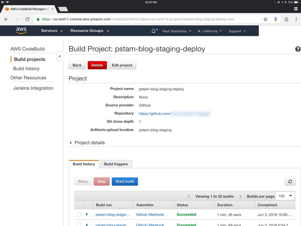 Optional: Integrate AWS Simple Notification Service to alert your phone when builds are initiated and completed. I haven’t done this yet but seems like a neat thing to add.