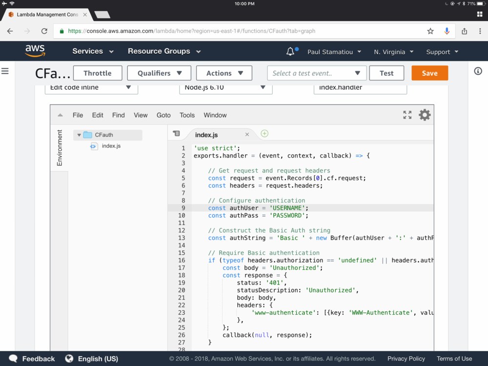 Create new Lambda function to add Basic HTTP auth to the new CloudFront distribution. Copy Lambda function ARN.