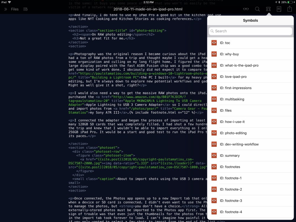 Textastic: Another writing app?? Yes, but this one is a code-focused text editor. I use it in the more final stages of my articles when I need to write markup, start saving files and so on. I like Textastic as it pairs well with the Working Copy app to edit files from my git repository (all thanks to iOS 11 Files support).