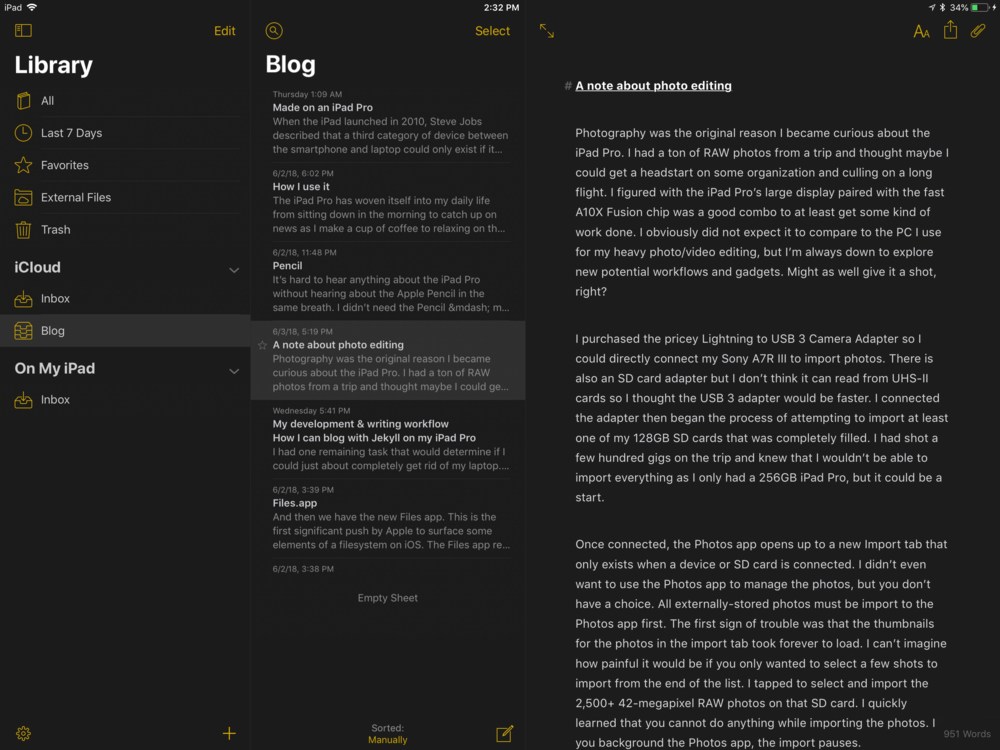 Ulysses: While not quite fully integrated into my writing workflow yet, I am testing it out. If Bear is closer to TextEdit.app/Notepad.exe, then Ulysses is Microsoft Word. It has gobs of functionality that I can’t even do justice by describing. I use it while coming up with the structure of my blog posts. While I may put random notes and blog post outlines in Bear, I have started using Ulysses to turn each outline item into its own larger note ("Sheet").