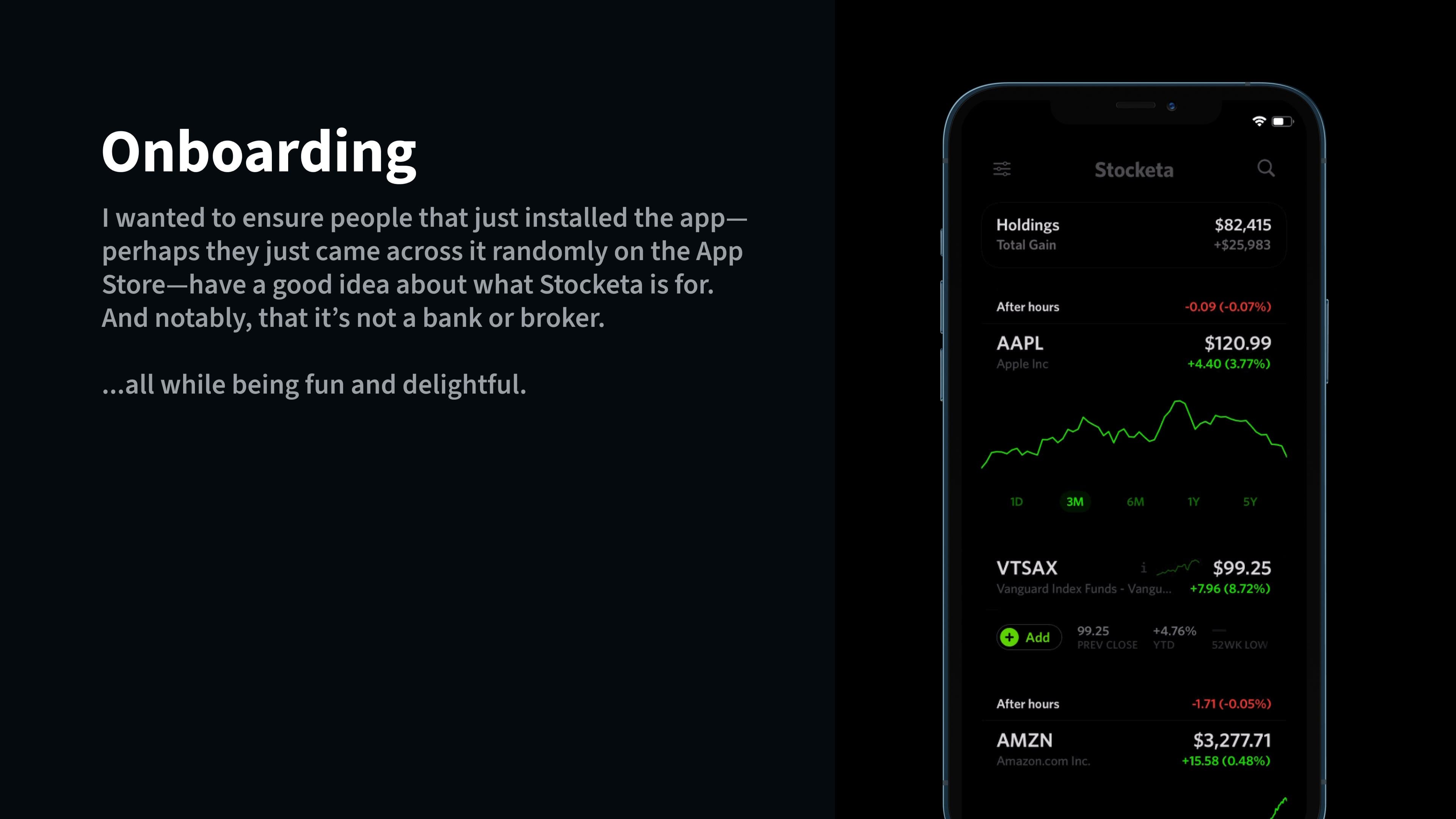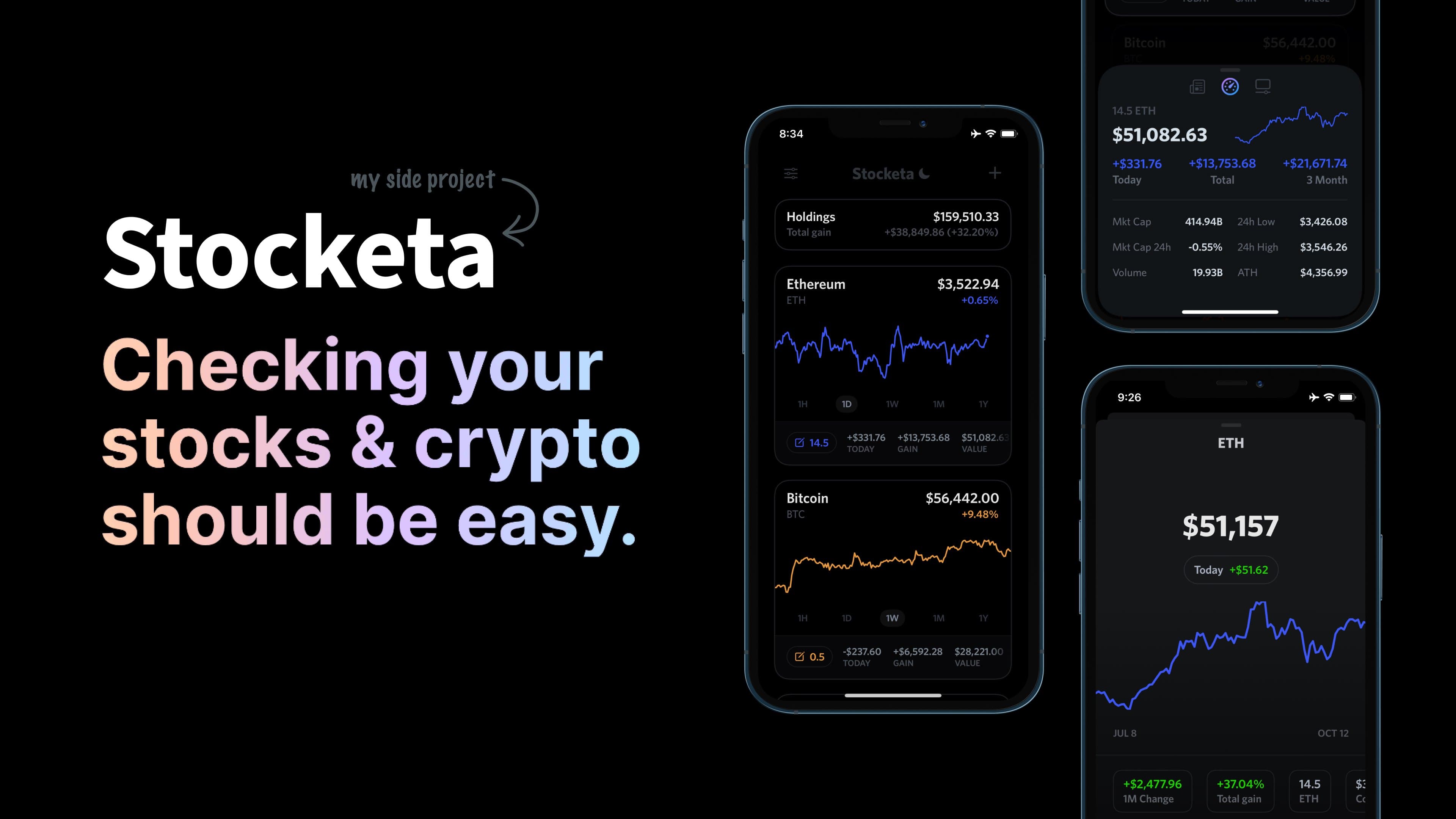 I originally started working on Stocketa with one goal: to learn Swift and SwiftUI my way with a project that was interesting to me. At the time that was scratching my own itch of keeping track of my investments. While it turned into a much larger and unshipped project, I learned a ton about native iOS development and was able to push myself creatively.