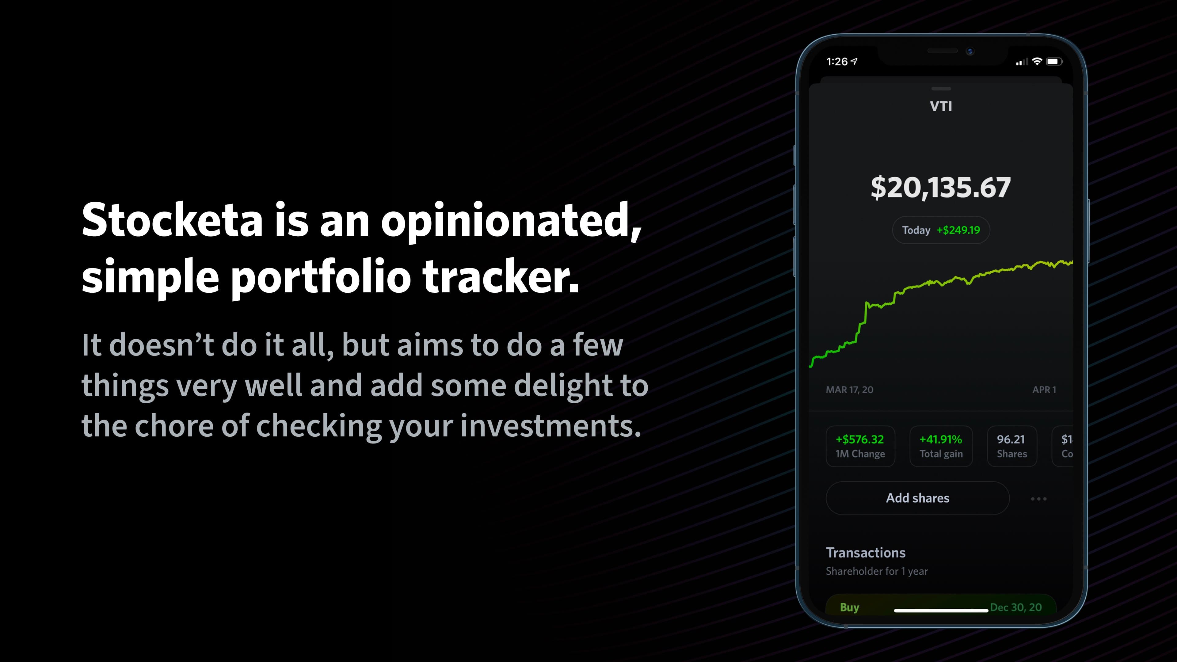 Stocketa was a simple portfolio tracker designed with care. It came out of my frustration of having to check the clunky apps and sites that my brokers had just to get a glimpse at how my investments were doing. I'm a casual investor and don't need much from a tool like this but I had assets in various places, and I just wanted one easy and well-designed place to check them. I wanted to see real per-transaction gain/loss info, based on my own cost basis.