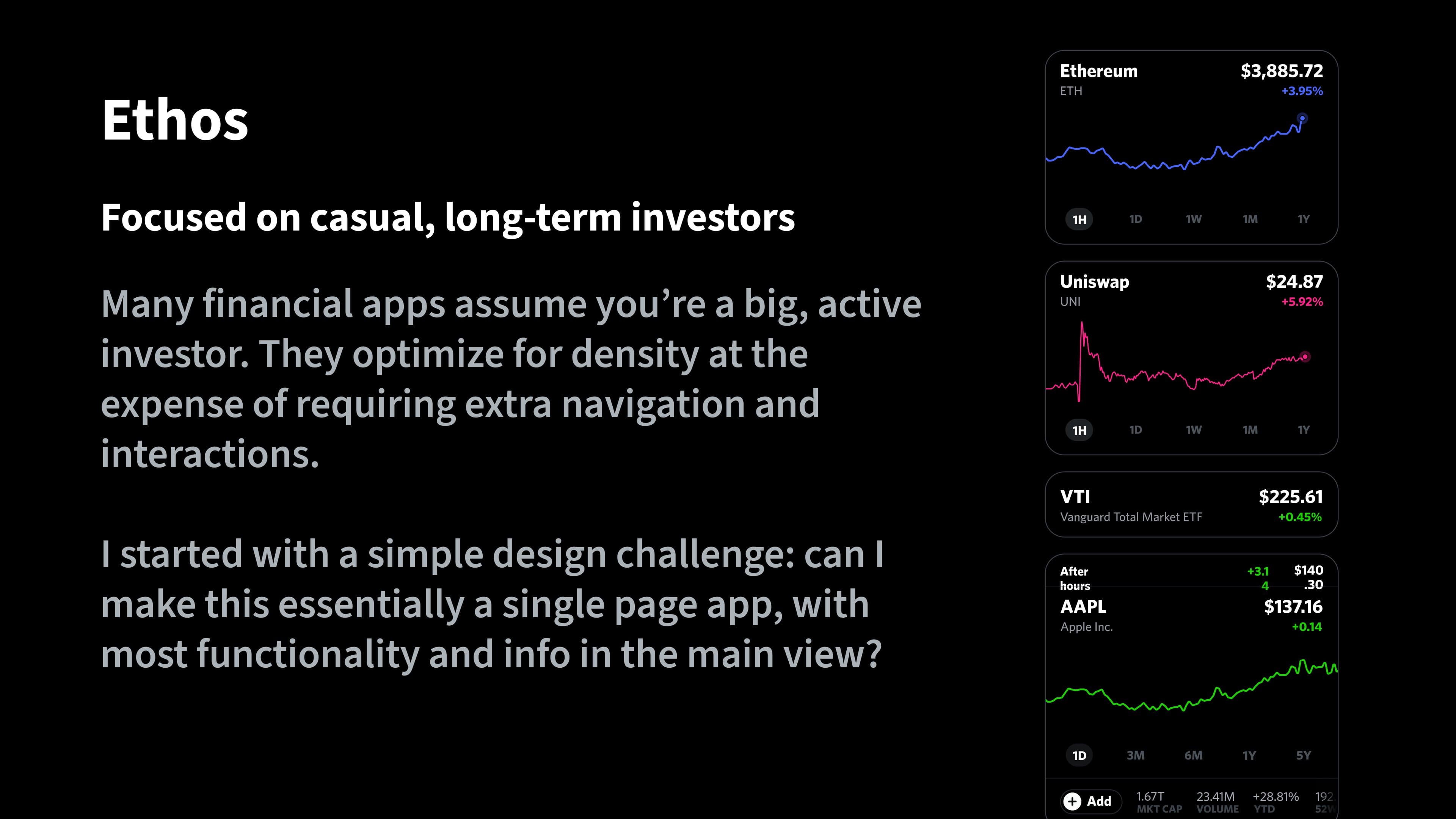From a design perspective, I generally found that financial apps bias towards density when displaying your assets. They assume you have tons of stocks and prioritize a list view where you have to tap in to a detail view to see more info. I found myself constantly tapping in, manipulating a chart or looking at some basic stats, then swiping back and repeating all that for several stocks. It was not easy or the kind of at a glance info I wanted.