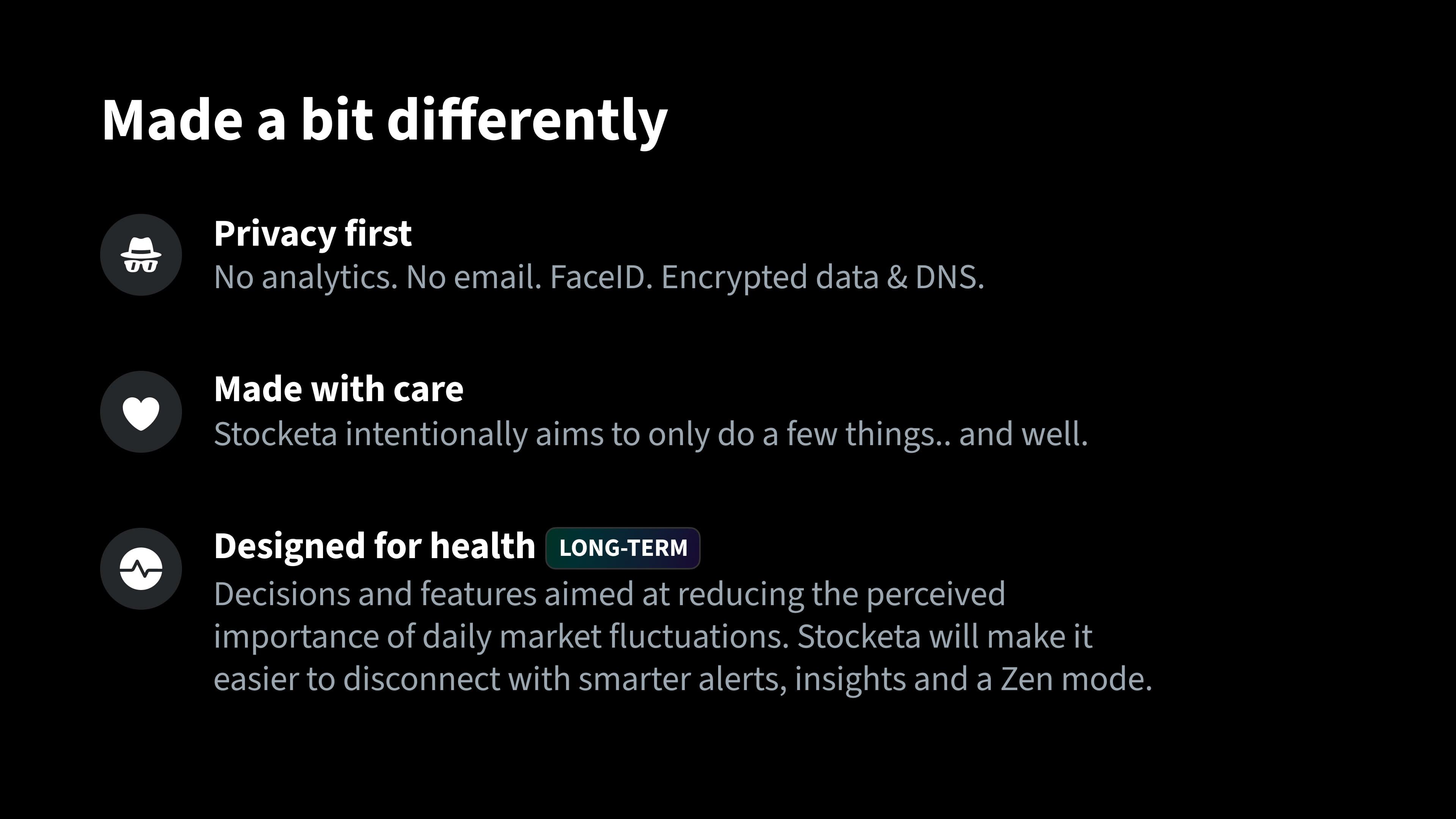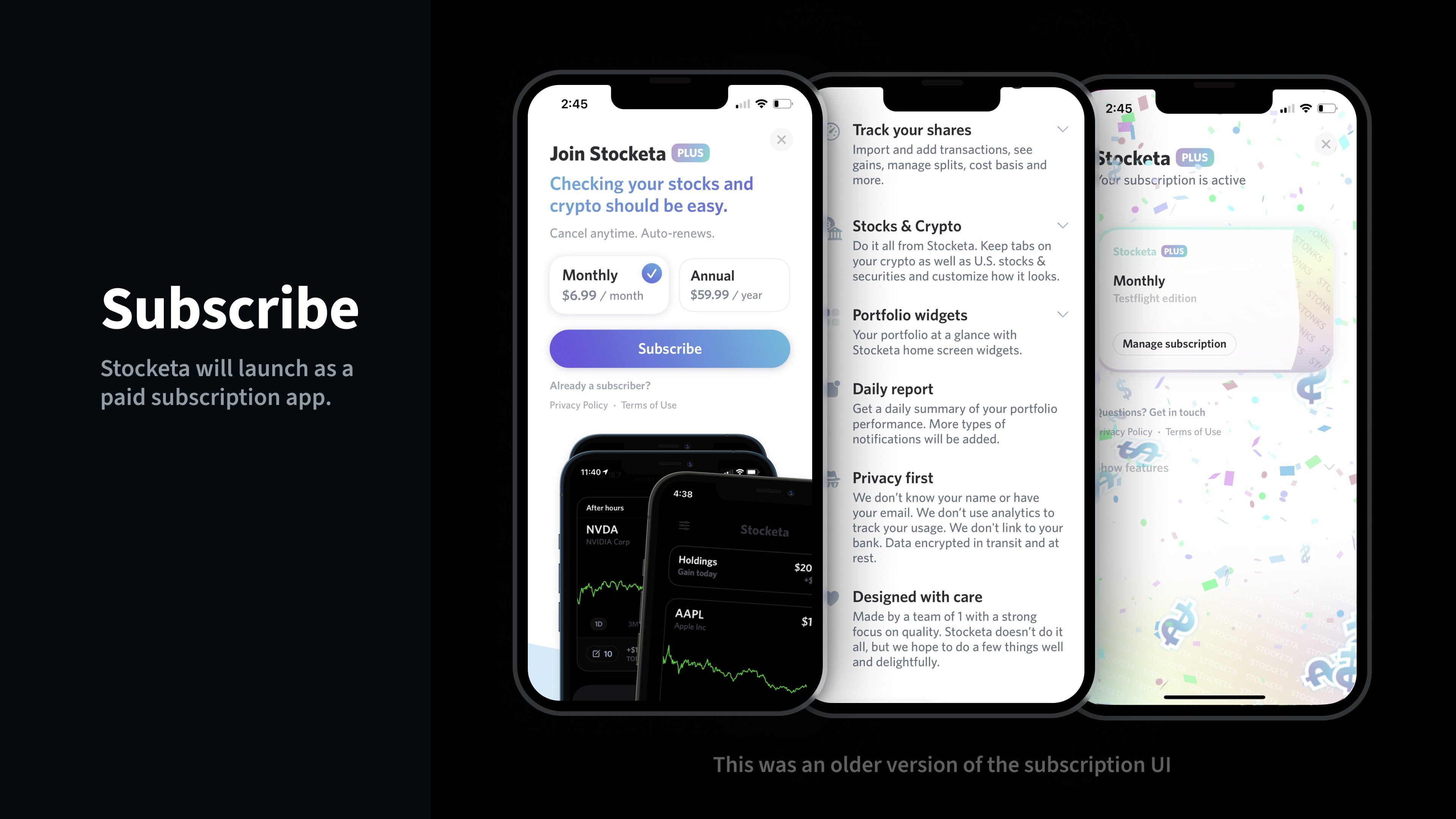 Stocketa was always meant to be a side project—never a real business. For it to be a real business, I would need to keep adding functionality and introducing more ways to make money. I couldn't just have a simple and elegant little app tracking your stocks. It would have to do more, like dipping into financial advice services, or offering stock trading. That's a hyper-competitive space lined with massive companies. That would mean a busier, cluttered app. The exact reason why I started Stocketa was because of all those cluttered apps.