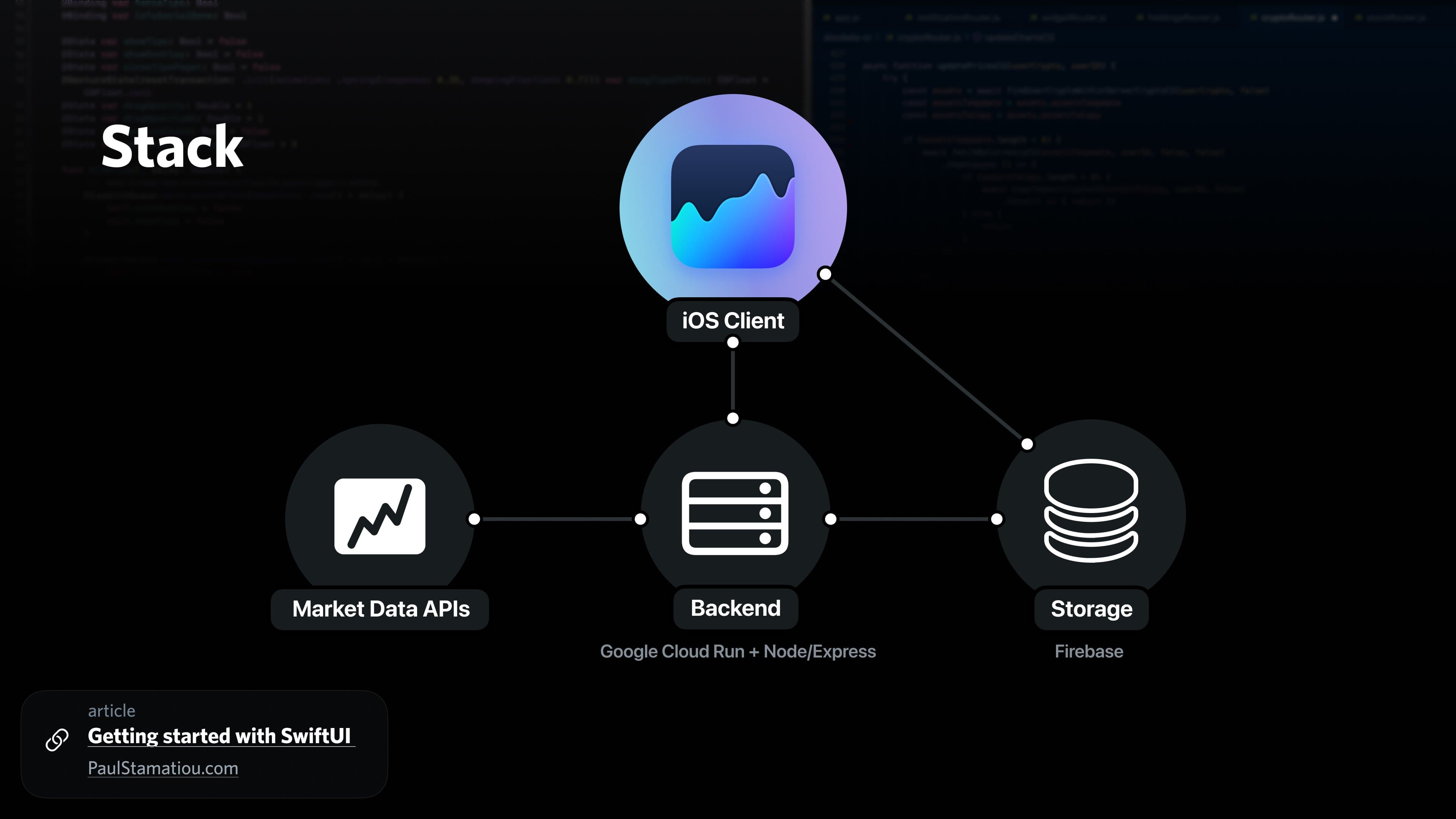 At first, this was so I didn't have to include the API key for my financial data provider inside the app for security reasons—I wouldn't want someone to find it and start running up my bill by abusing it. I created a backend proxy for the API with rate-limiting and throttling. Then, I wanted to have it be authenticated with user accounts, so I added Sign In With Apple along with a stock data caching system so that I only had to fetch stats for a stock once with a certain time period (depending on the particular stat that was either seconds, 24 hours, or weekly) regardless of however many user accounts needed that stock info. The main goal with that was to also reduce my costs associated with financial data API usage.