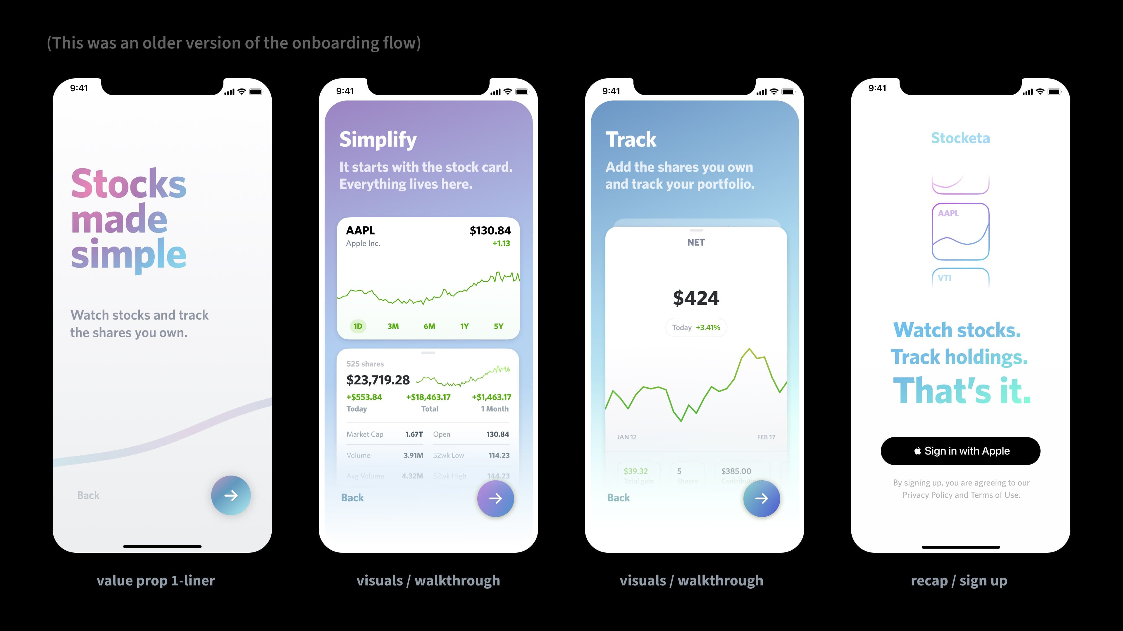 Same experience as above, but dark mode. One variation I made for dark mode was the opening "shimmer" effect over the Stocketa logo is done with a more colorful gradient instead of a regular white gradient.