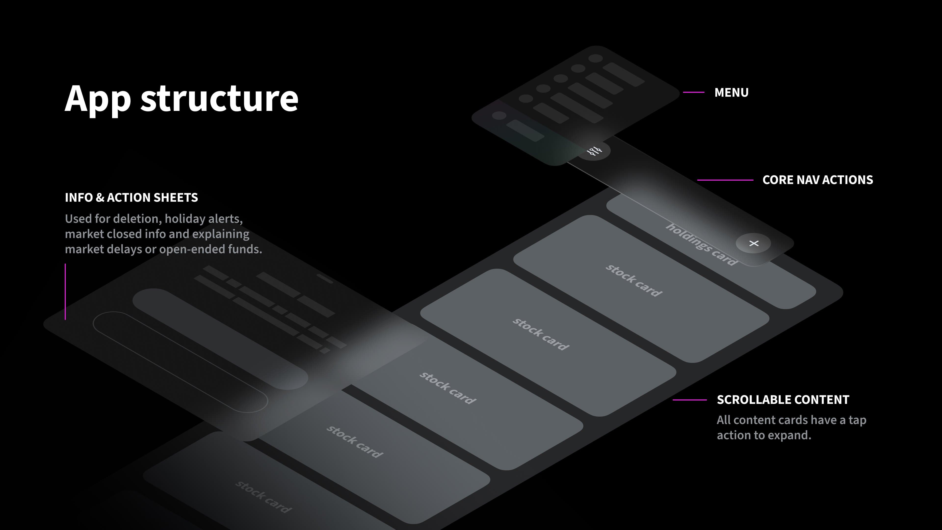 The holdings card sits at the top of the main stock scroll view showing aggregate details, based on your settings. Longer term I had planned to evolve this with sparkline sharts for each stock, as well as the aggregate portfolio, as well as move away from the expanded card form factor which felt limiting.