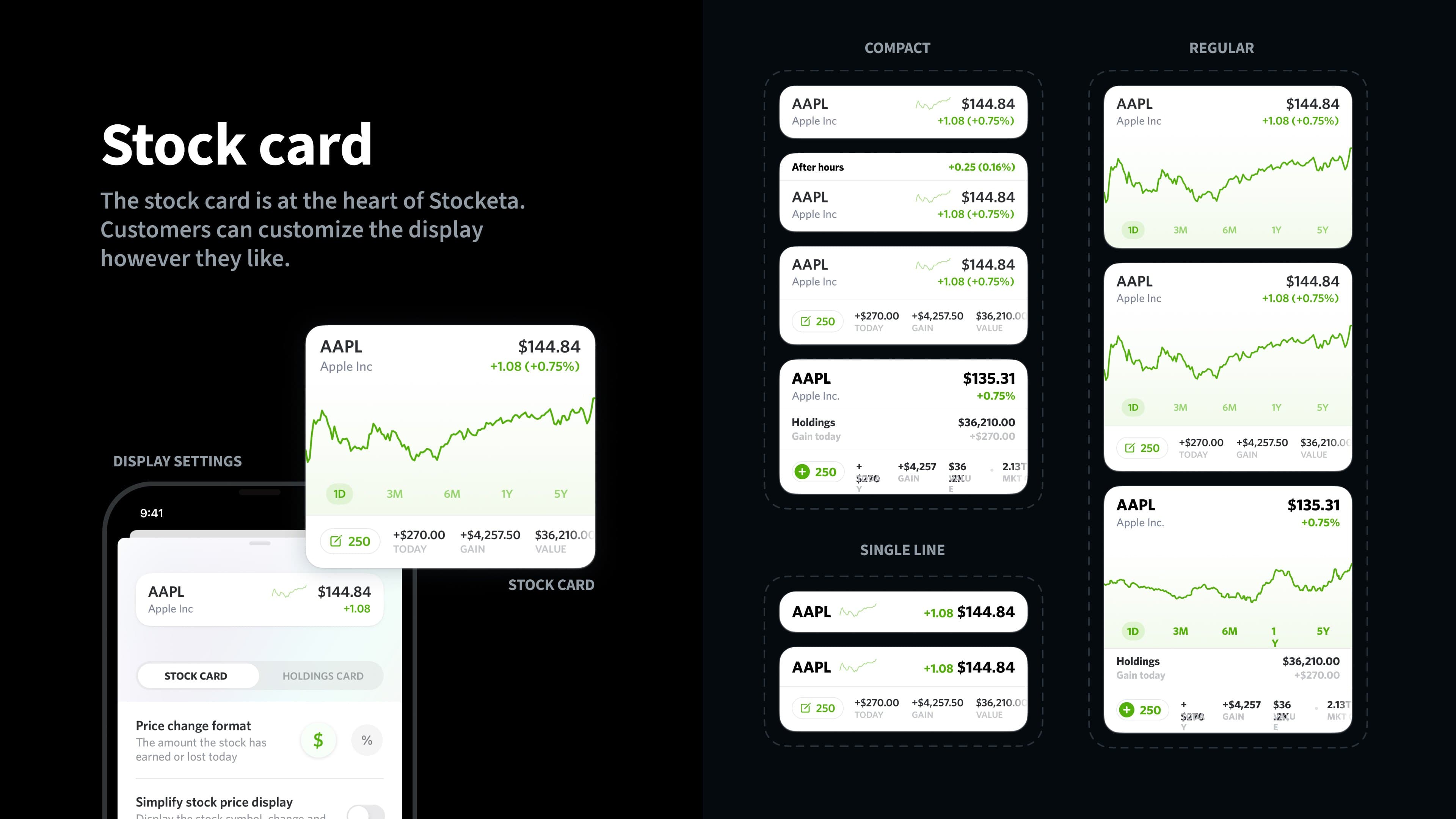 While the focus of Stocketa is about giving casual investors access to common actions they may need on a stock without navigating to a detail view (such as chart scrubbing or stats), I wanted this to be customizable. I have several stock card form factors, settings, and some neat custom micro-animations when toggling them.