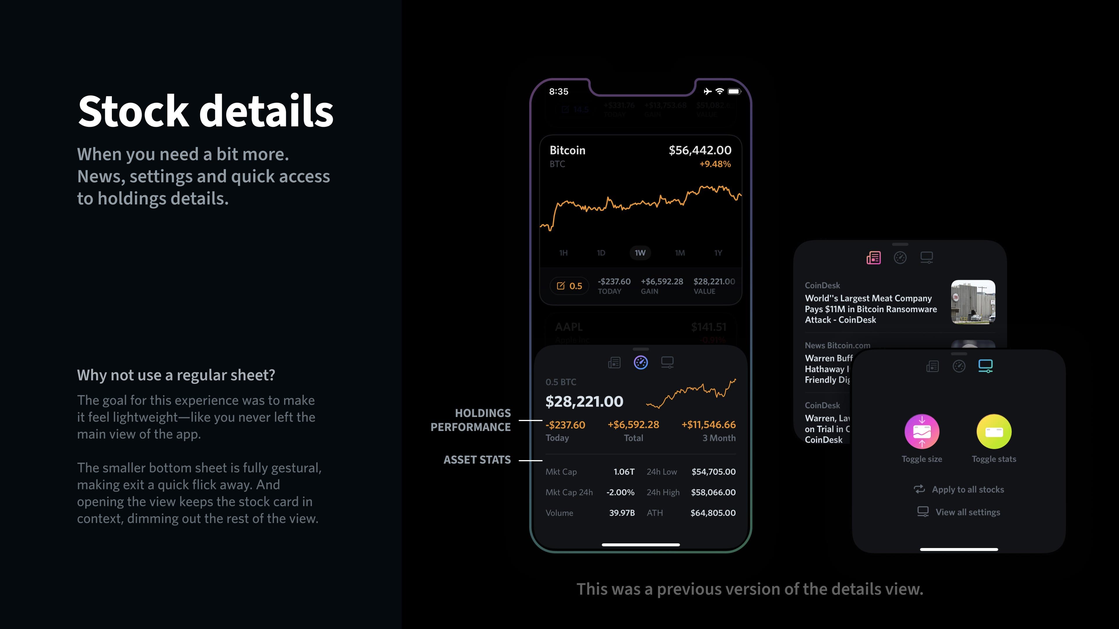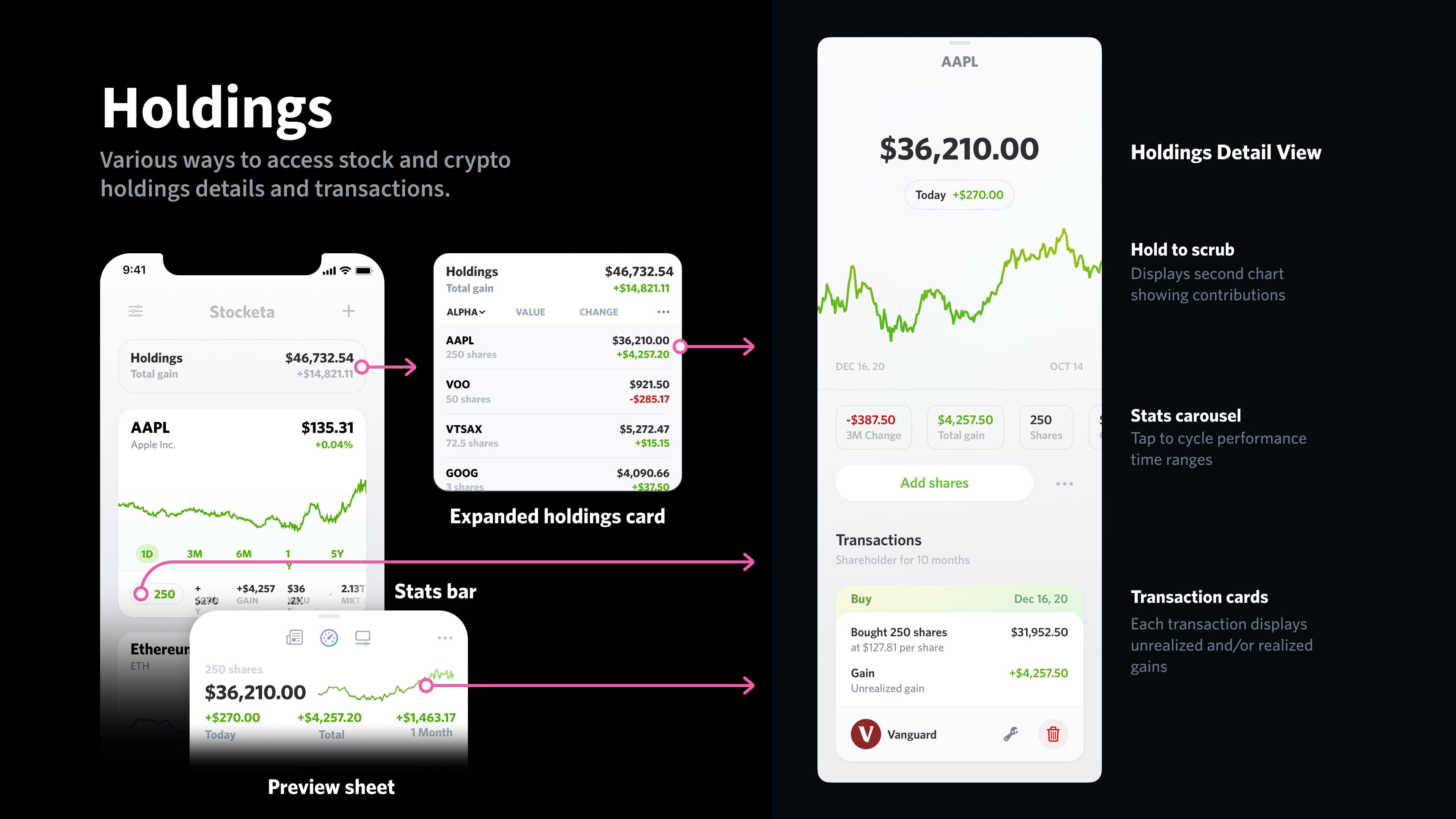 For further actions, a tap transports you to another elevation where the stock card stays in place, but everything else vanishes while related cards (like stock news, and holdings details) animate in. This was tricky to pull off well, but the key was overlayPreferenceValue and anchorPreference.