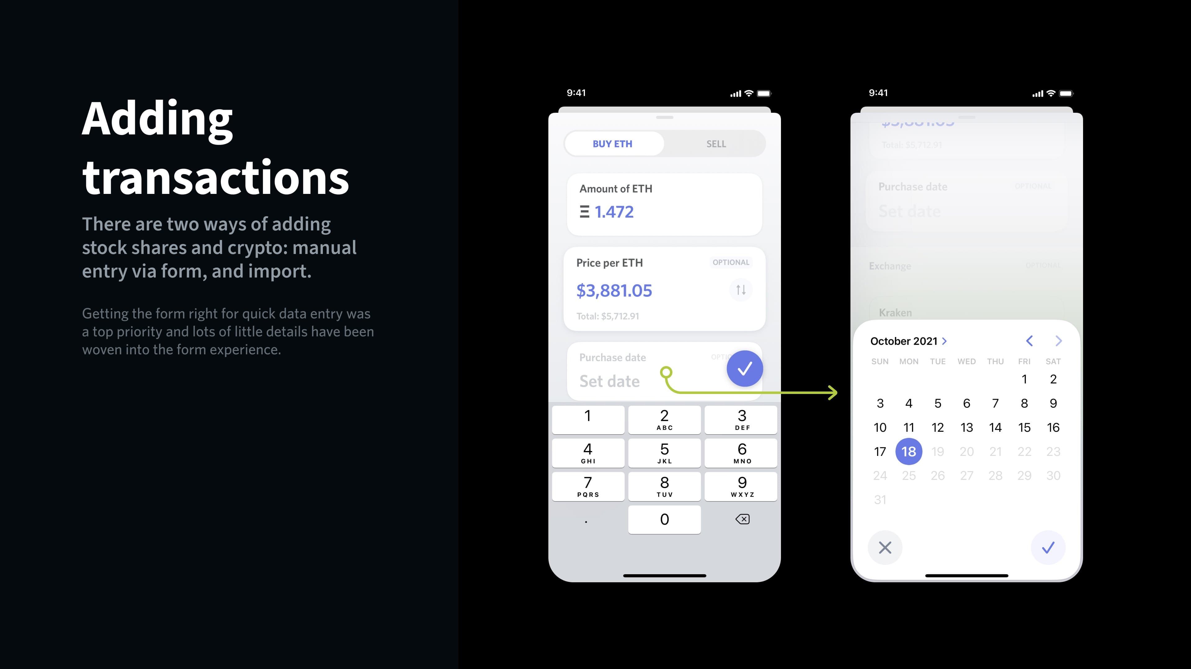 Stocketa allows users to manually add stock transactions. While this could have been a boring form with default iOS components, I wanted to make it feel like it was made for stocks. The form places the most focus on the essentials: quantity, price and, optionally, date.