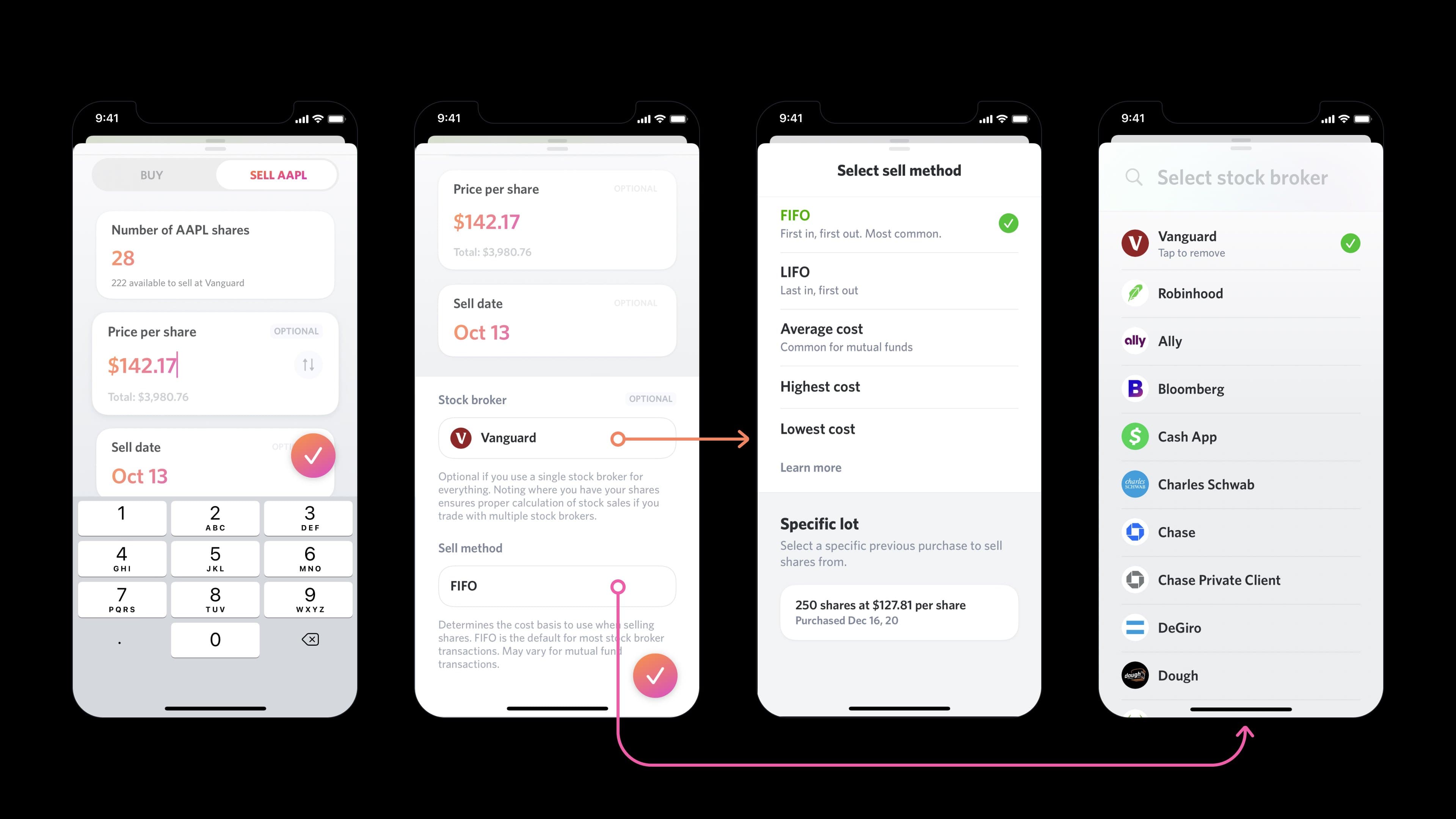 Similar to above, this flow shows off adjusting the cost basis method. Stocketa supported all the basics like FIFO, LIFO, Average cost (default for mutual funds), Highest cost, Lowest cost, as well as specific lot if you're doing something a bit more advanced.