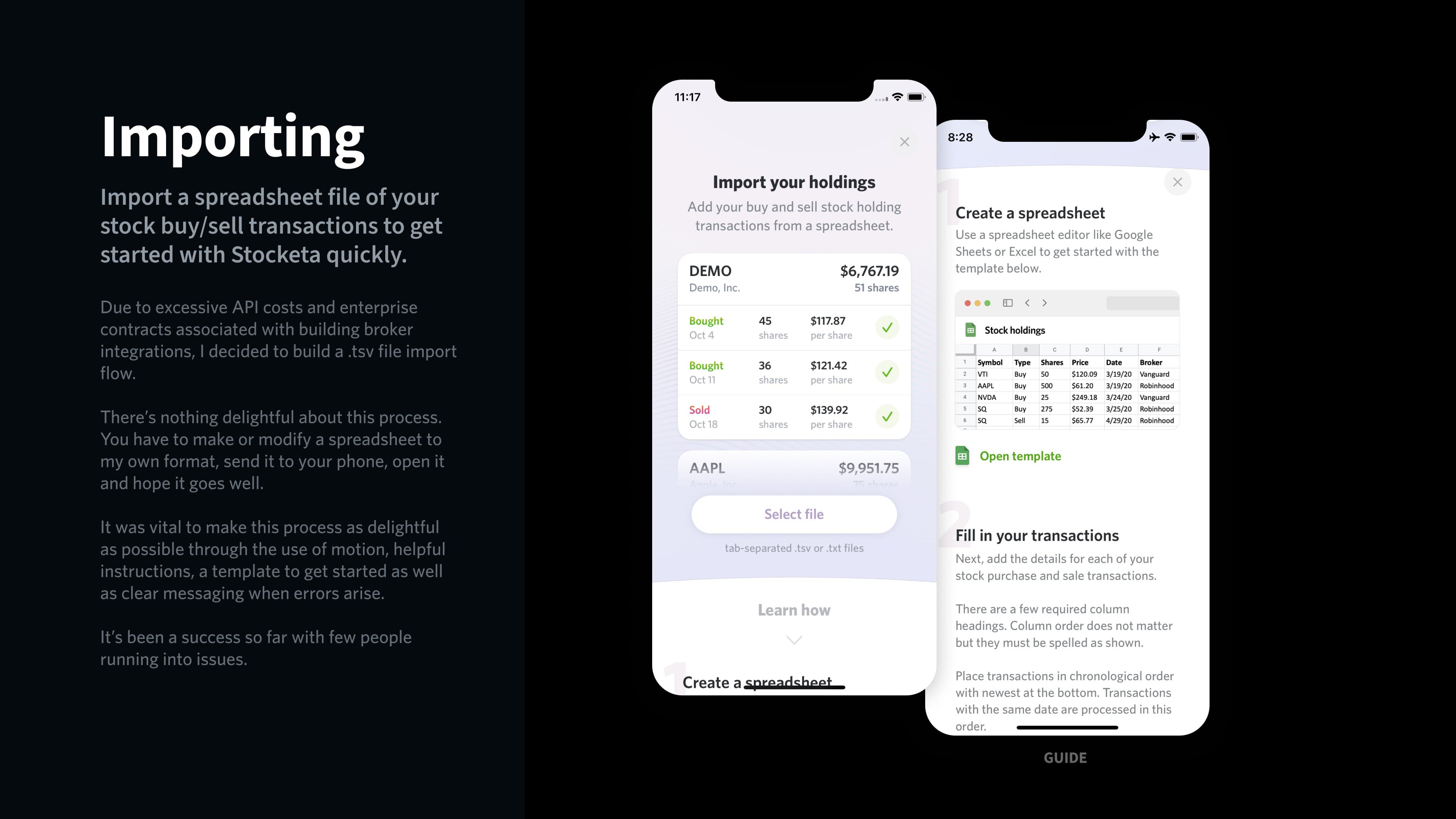 While you can manually add individual buy and sell transactions, the Stocketa import flow made this quicker via a tsv file that you can create via a spreadsheet. It also writes back to the tsv file to confirm import status so you can import again later when you add new shares on your desktop, synced via iCloud.