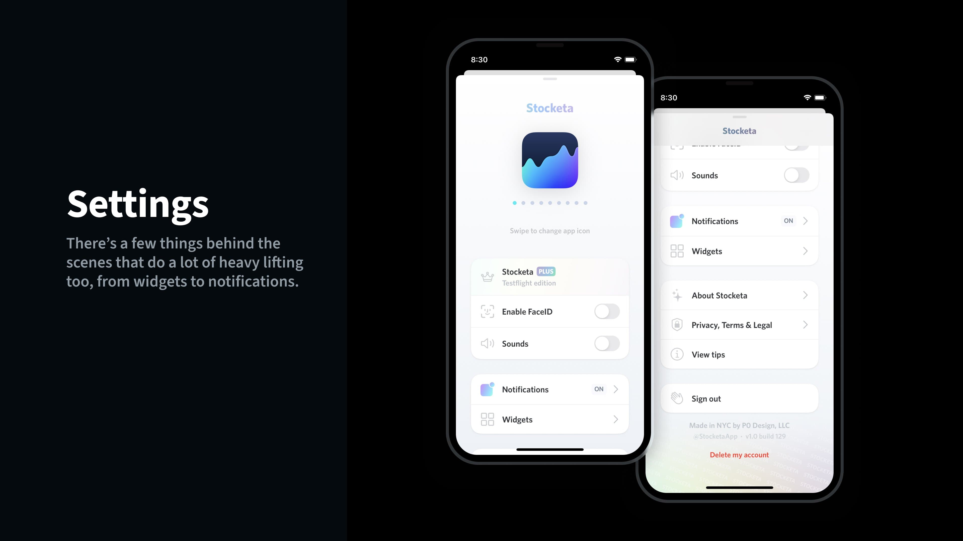 While settings sheets are nothing special, I put a bit more attention into Stocketa's. A few things of note: custom header on scroll, app icon selection carousel at top that scales on scroll, footer gradient with Stocketa "foil" that you can keep pulling up, and some push views with custom headers.