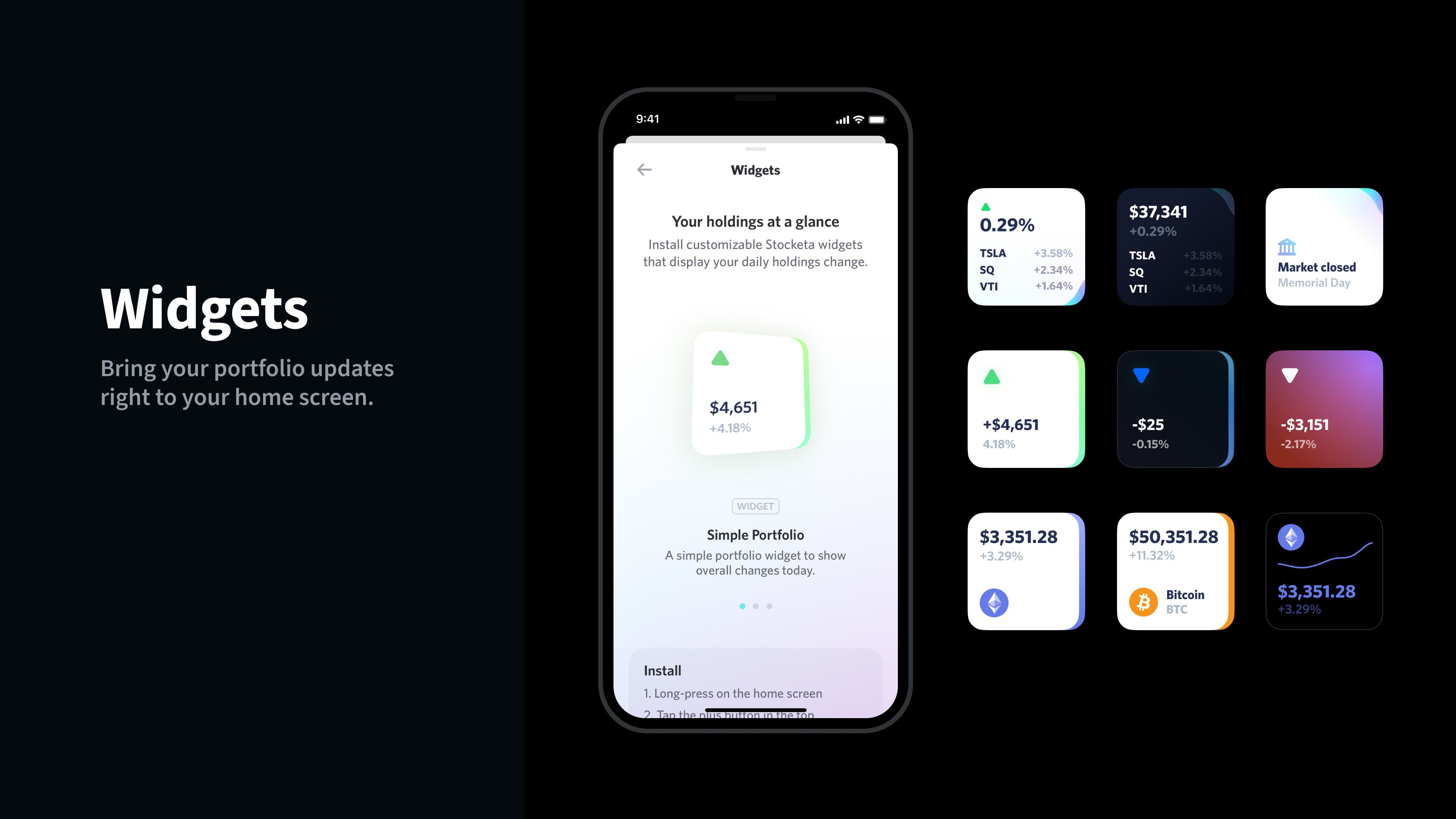 Showing off how setting up an iOS widget for Stocketa worked. There were three widget types: individual stock, portfolio, and simple portfolio. They all had accent colors using a large gradient that would change based on stock or portfolio performance.